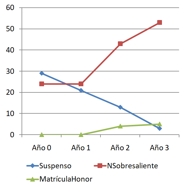 Nuestro enfoque favorece el trabajo cooperativo entre alumnado y profesorado, facilitando el aprendizaje autónomo y garantizando la transferencia de conocimiento entre las diferentes promociones que cursan esta materia, así como con otros entornos de aprendizaje similares. Pero además pone énfasis en el intercambio de ideas y en el desarrollo del espíritu crítico, que se complementa con la mejora de habilidades para gestionar la información de una manera activa y comprometida. De la indudable efectividad de este PID da cuenta el siguiente gráfico, que muestra la evolución del rendimiento académico tres años después de su implantación: