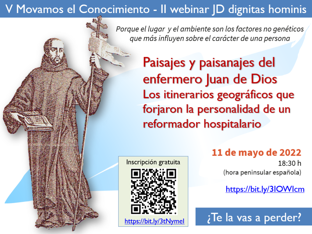 Vinculado a las celebraciones del Día Internacional de la Enfermera, tuvo lugar el 11 de mayo de 2022 el webinario “Paisajes y paisanajes del enfermero Juan de Dios. Los itinerarios geográficos que forjaron la personalidad de un reformador hospitalario”, que se ha hecho coincidir con el V Movamos el Conocimiento Enfermero, organizado conjuntamente por el Consejo de Enfermería de la Comunidad Valenciana (CECOVA) y la Fundación Index. Es la segunda actividad del ciclo JD dignitas hominis, que tendrá continuidad en octubre de este año con la celebración en Granada los días 20 y 21 del II Coloquio sobre Juan de Dios y la reforma de la Enfermería, organizado por el Colegio de Enfermería de Granada.