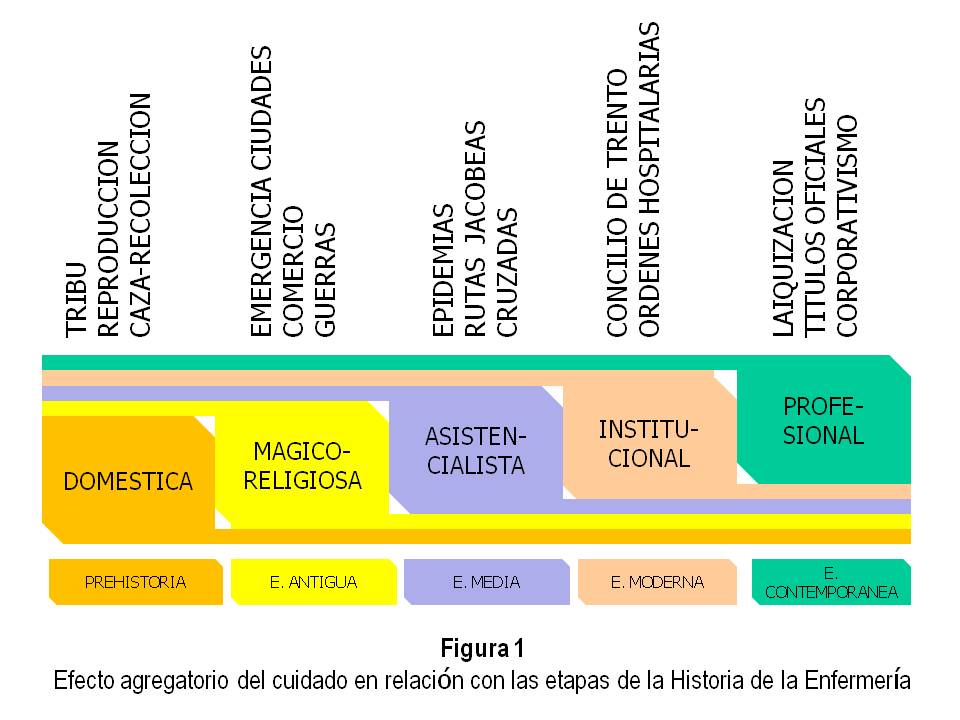 Acorde con la etimología de la palabra cuidar (del lat. cogitare, pensar), la práctica de la Enfermería ha de sustentarse en formas de pensamiento y por tanto habrá tantas enfermerías como mentalidades puedan concebirlas. A diferencia del conocimiento científico-técnico, que tiende a sustituirse en función de sus avances, el pensamiento enfermero tiene un efecto agregatorio, lo que explica la yuxtaposición de modelos que se produce conforme la sociedad avanza (es propio de nuestra sociedad la convivencia de modelos de cuidados de tipo doméstico, con otros de origen mágico-religioso, o con prácticas asistencialistas e institucionales, y en todas ellas se dan formas de práctica profesional. Ver figura 1).