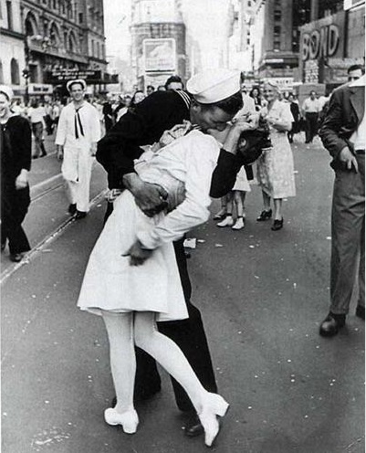 beso-enfermeraEl fotógrafo, Alfred Eisenstaedt, originario de Prusia, transmitió al mundo en agosto de 1945 la alegría de un marinero y una enfermera, a través de una imagen que ha quedado inmortalizada.  Los protagonistas de la imagen celebraban con un apasionado beso el triunfo definitivo de las tropas estadounidenses sobre las fuerzas japonesas en la Segunda Guerra Mundial. Lo más importante es lo que se esconde detrás de esta foto, ¿por que besa a una enfermera? No es que fuese su pareja, es más, ni si quiera se conocían, pero el propio marinero asumió que fue una manera de agradecimiento por todos los sacrificios que estas mujeres realizaron a lo largo de aquellos duros años durante la guerra.