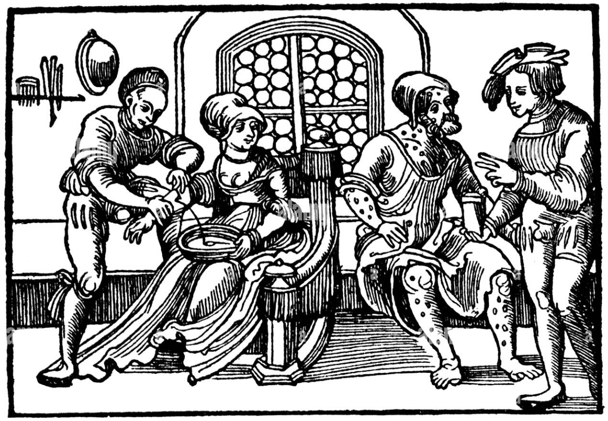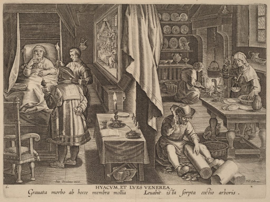 Referencia: ‘Hyacum et Lues Venerea’, grabado es de Philipp Galle (1537-1612), ca. 1590/1593, a partir de la pintura original de Johannes Stradanus (1523-1605), también conocido como Giovanni Stradano o Jan Van der Straet. De la Serie Nova Reperta, Washington, National Gallery of Art.