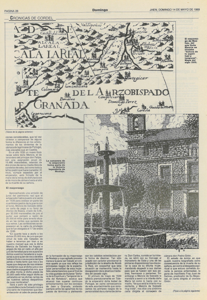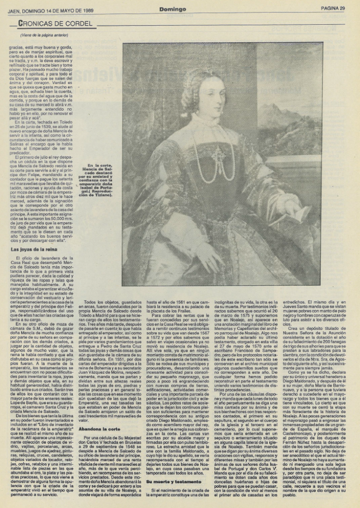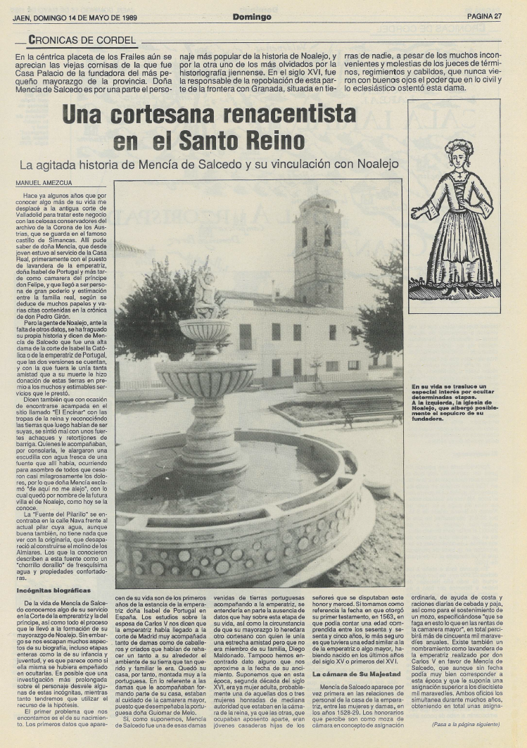 Desde el pasado año se está hablando mucho sobre la historia de Noalejo y sobre Mencía de Salcedo, algo de lo que me alegro, pues desde un primer momento estuve convencido que esta es una historia singular que merece la pena conocerse y no solo por el vecindario. Lo que no esperaba es que, hasta ahora, todo lo que se vende como «nuevos descubrimientos» ya aparece en mi libro y en otras obras posteriores, Wikipedia incluida, que no parecen encontrar el debido reconocimiento por los nuevos descubridores. Lo que me lleva a afirmar que lo que se está haciendo no es investigación, sino divulgación, que también es sumamente necesaria.