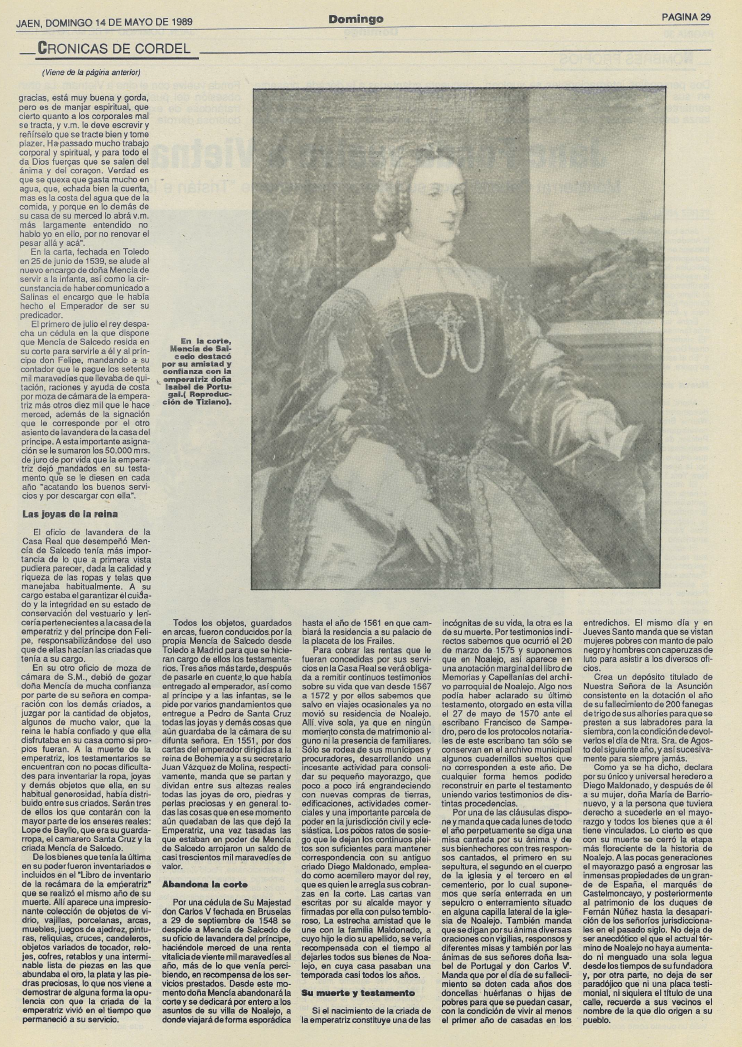 Aquí dejo el artículo de Diario Jaén con el que inauguré mi sección «Crónicas de Cordel» en el año 1989, al que siguieron otros sobre la feria de Noalejo, sobre las reliquias de Mencía de Salcedo, sobre la fiesta de toros, sobre el Santo Custodio y otros temas diversos.